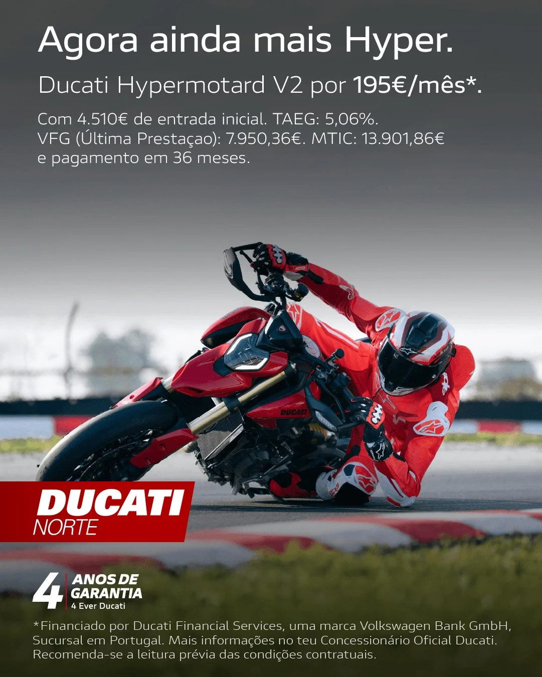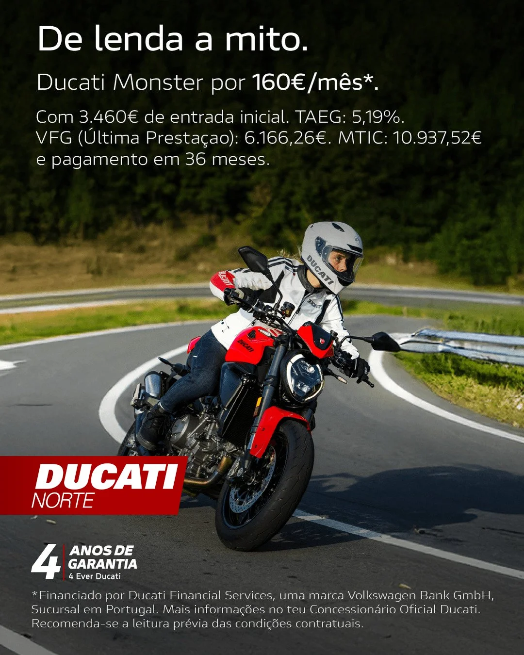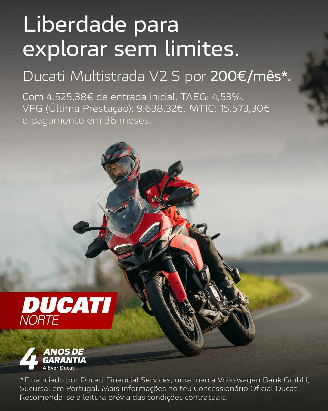 Campanha válida até 31/03/2026. Valor Final Garantido – última prestação do contrato que pode ser liquidada contra a entrega do veículo, desde que observadas as condições indicadas em www.vwfs.pt. Imagem não contratual. Financiado por Ducati Financial Services, uma marca Volkswagen Bank GmbH, Sucursal em Portugal. A Ducati Norte, registada no Banco de Portugal sob o n.º 0000917, actua como intermediário de crédito a título acessório e não exclusivo.