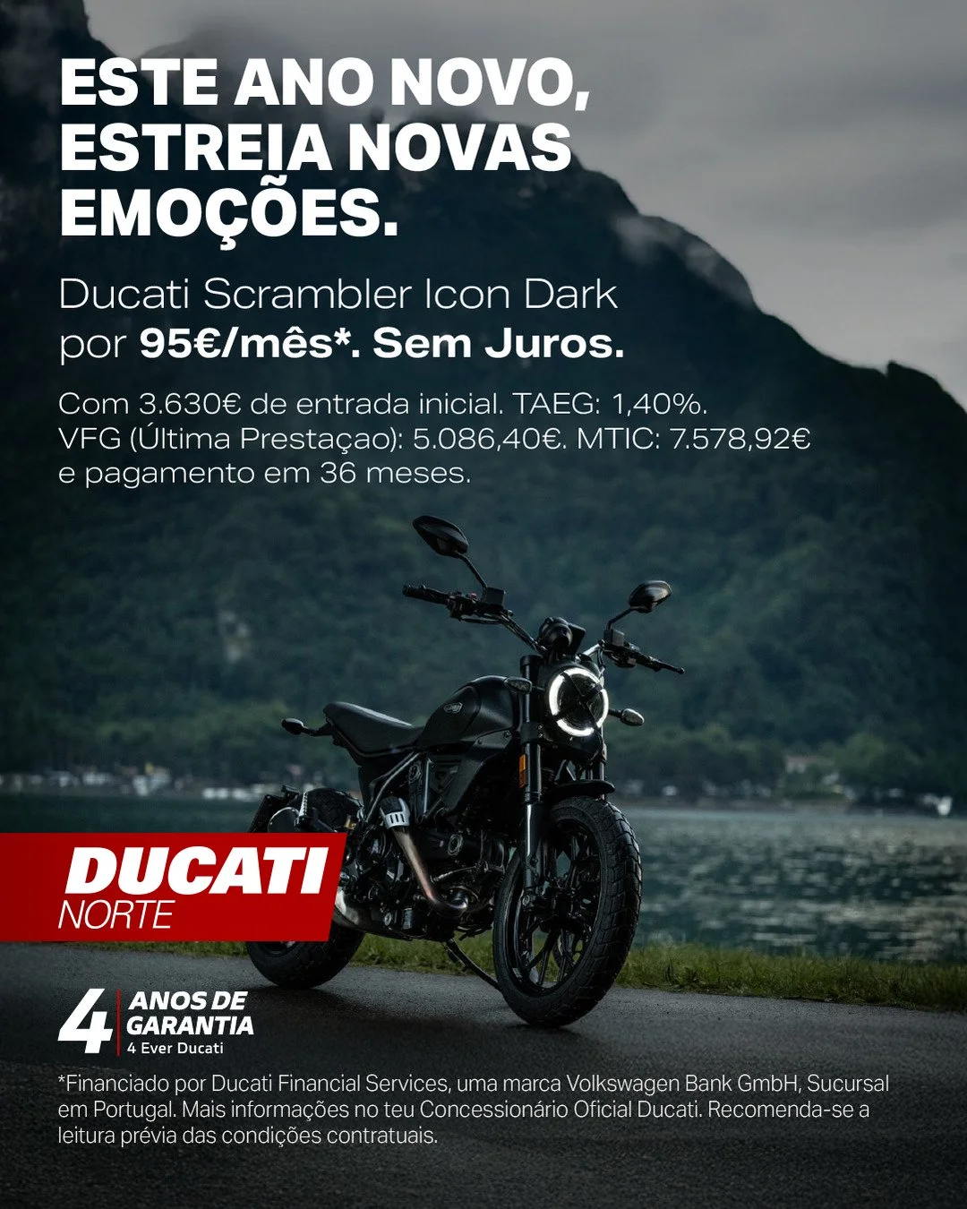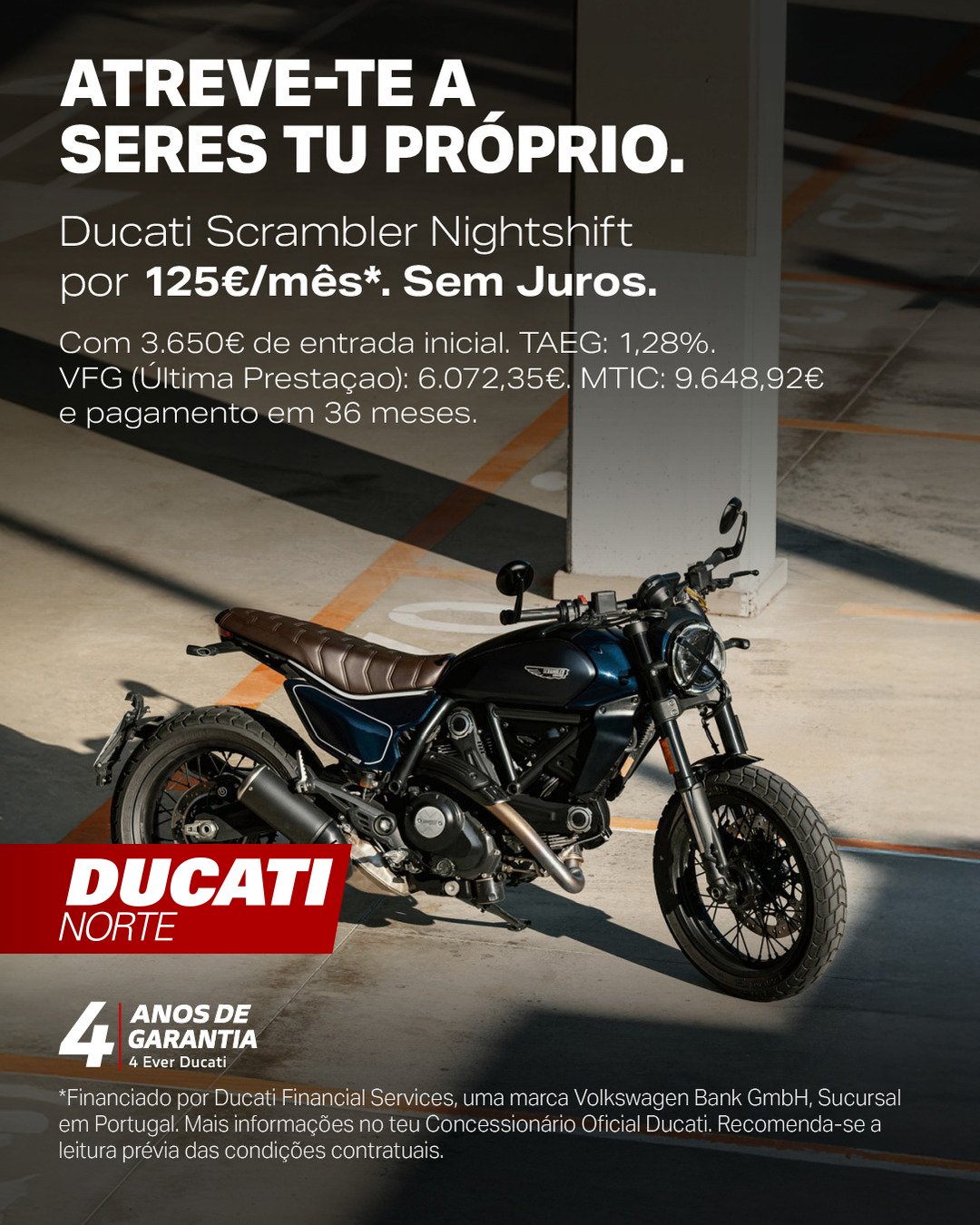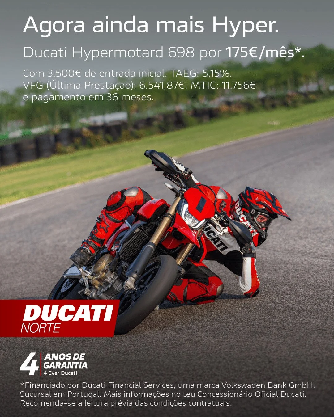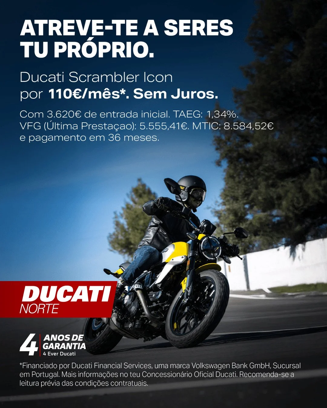 Campanha válida até 31/03/2026. Valor Final Garantido – última prestação do contrato que pode ser liquidada contra a entrega do veículo, desde que observadas as condições indicadas em www.vwfs.pt. Imagem não contratual. Financiado por Ducati Financial Services, uma marca Volkswagen Bank GmbH, Sucursal em Portugal. A Ducati Norte, registada no Banco de Portugal sob o n.º 0000917, actua como intermediário de crédito a título acessório e não exclusivo.
