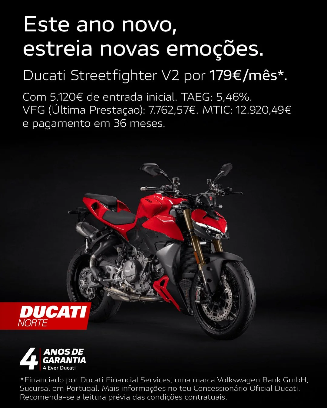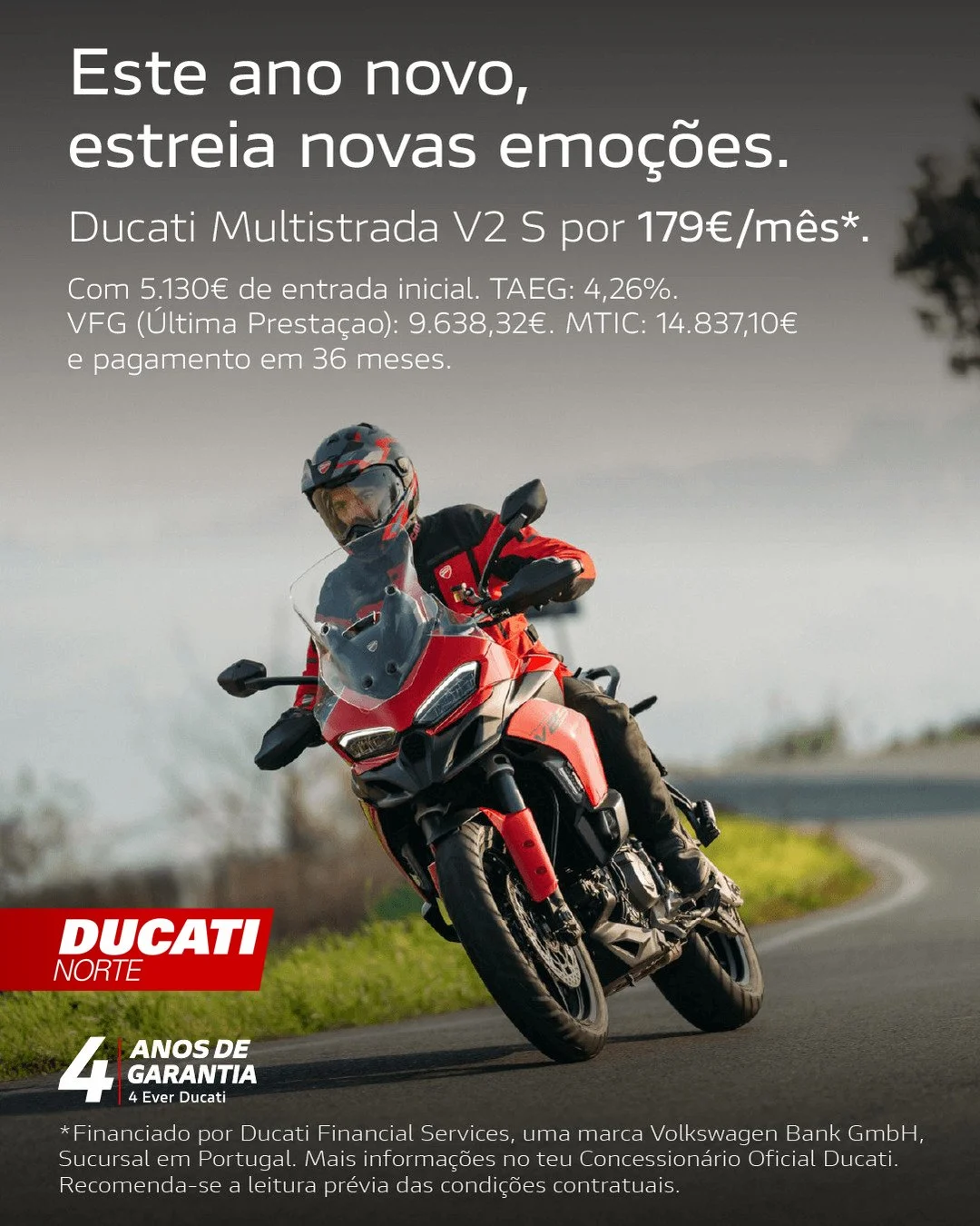 Campanha válida até 31/1/2026. Valor Final Garantido – última prestação do contrato que pode ser liquidada contra a entrega do veículo, desde que observadas as condições indicadas em www.vwfs.pt. Imagem não contratual. Financiado por Ducati Financial Services, uma marca Volkswagen Bank GmbH, Sucursal em Portugal registado(a) no Banco de Portugal sob n.º 264. Mais informações em https://www.vwfs.pt/. Recomenda-se a leitura prévia das condições contratuais.