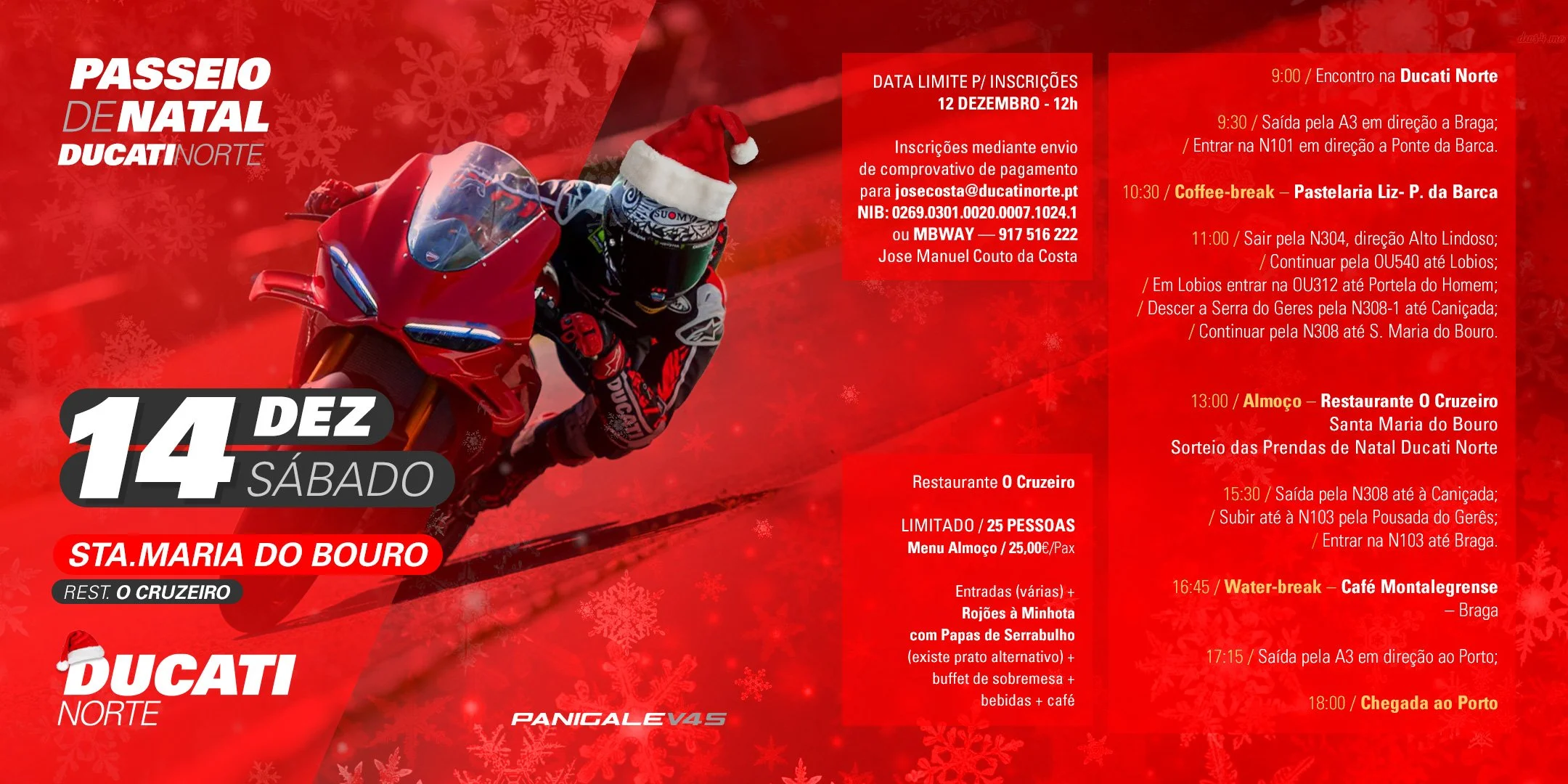 Com o verdadeiro Espirito de Natal, convidamos todos a participar no já tradicional Passeio de Natal da Ducati Norte, a Santa Maria do Bouro. “Deslizaremos” pelas N101 até Ponte da Barca onde teremos à nossa espera os famosos “Almendrados” da Pastelaria Liz. Continuaremos pela N203 até Alto Lindoso, entrando em Espanha até Lobios , onde subiremos até à Portela do Homem. A partir daí, será sempre a descer pela linda Serra do Gerês, até à Caniçada. O Restaurante O Cruzeiro, em Santa Maria do Bouro, receber-nos-á para um almoço tipicamente Minhoto onde as papas de serrabulho e as rabanadas são imperdíveis.