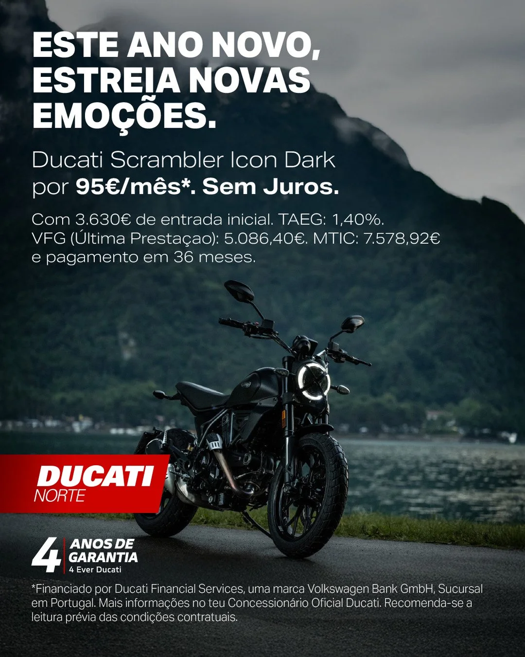 Contrato para 36 meses e 150000 Kms. PVP 10955,08€. Entrada Inicial de 3630,00€. Valor Financiado de 7325,08€ e Valor Final Garantido 5086,40€. MTIC de 7578,92€. TAN 0,00% e TAEG 1,40%. Acresce 125,00€ de comissão de abertura em Crédito Automóvel para viaturas novas com reserva de propriedade. Campanha válida até 31/03/2026. Valor Final Garantido – última prestação do contrato que pode ser liquidada contra a entrega do veículo, desde que observadas as condições indicadas em www.vwfs.pt. Imagem não contratual. Financiado por Ducati Financial Services, uma marca Volkswagen Bank GmbH, Sucursal em Portugal. A Ducati Norte, registada no Banco de Portugal sob o n.º 0000917, atua como intermediário de crédito a título acessório e não exclusivo.